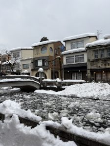なんとか城崎温泉まで電車は走っておりましたが、ひとたび降り立った城崎温泉はご覧のとおり笑。旅館のカニはもちろん美味しく、サイコーだったのですが、寒さと雪により城崎温泉の楽しみの一つであった立ち寄り湯は断念となりました。