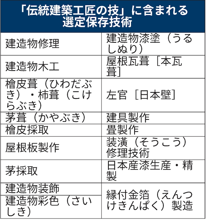 宮大工や左官職人らが古くから継承してきた17分野の技術の価値が世界的に認められたのです。